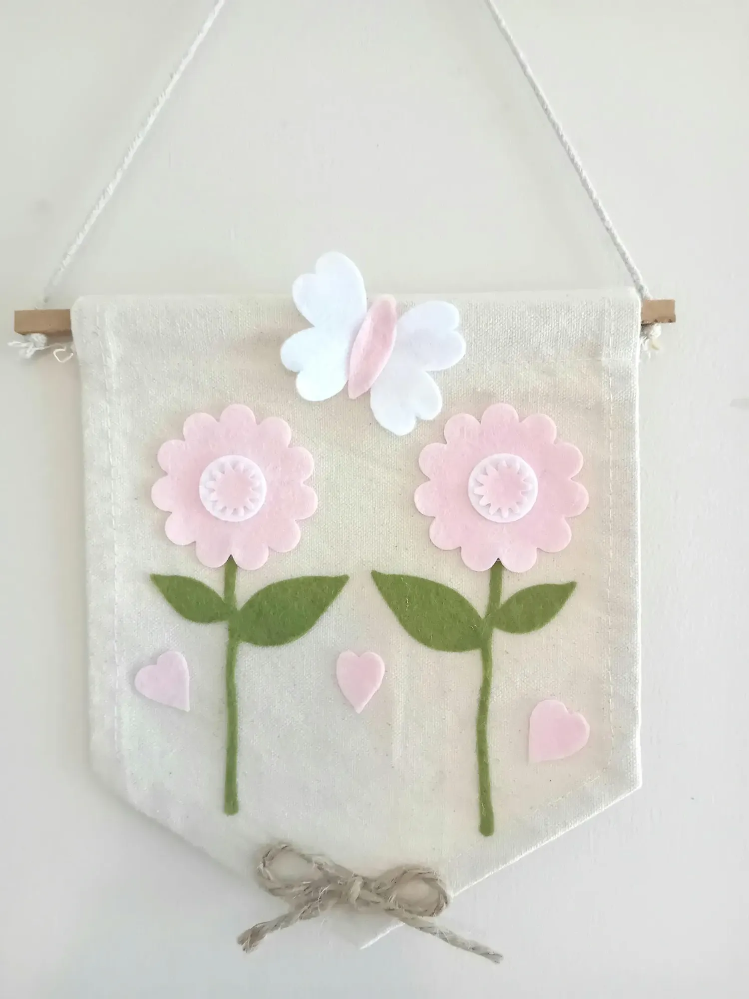 • Decorated with felt flowers, foliage, butterflies, and hearts