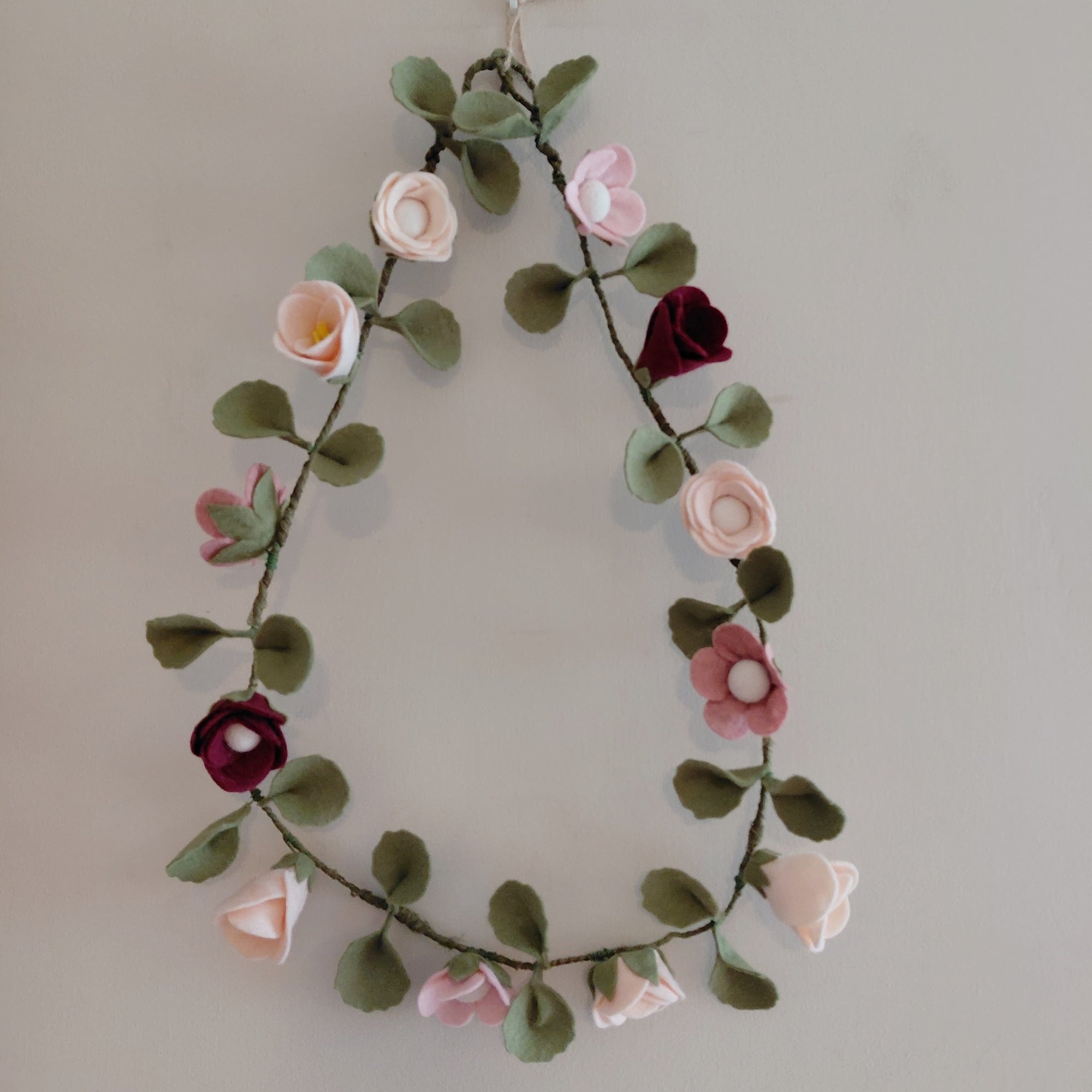 Each piece features handcrafted felt flowers in blush pinks, creamy whites, dusky rose tones, and deep berry shades, all nestled amongst leafy greens. Every petal is cut and shaped by hand, giving the collection its signature layered look and natural, rambling style.